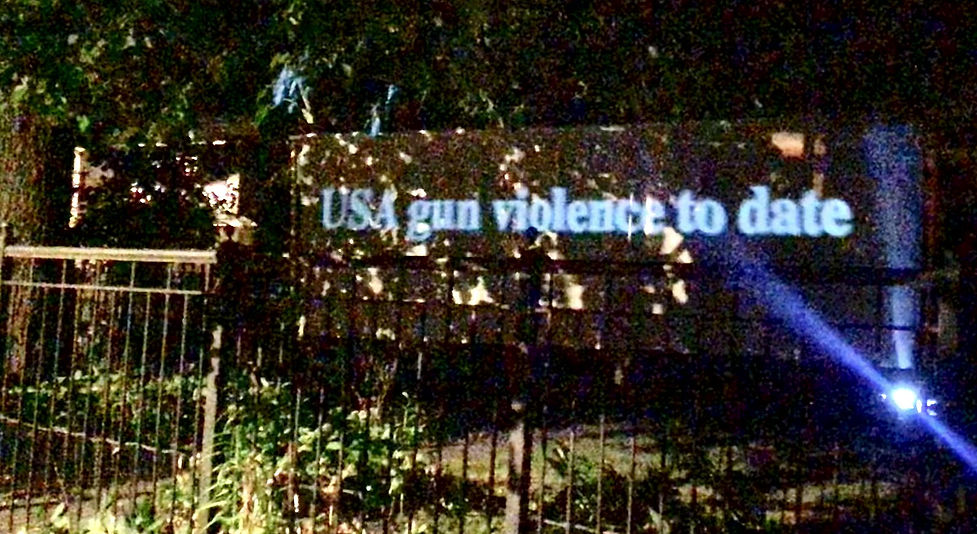 Video Projection on the street, weekly change in statistics, creating conversations with the public on gun violence in the US, especially with and by youth.
